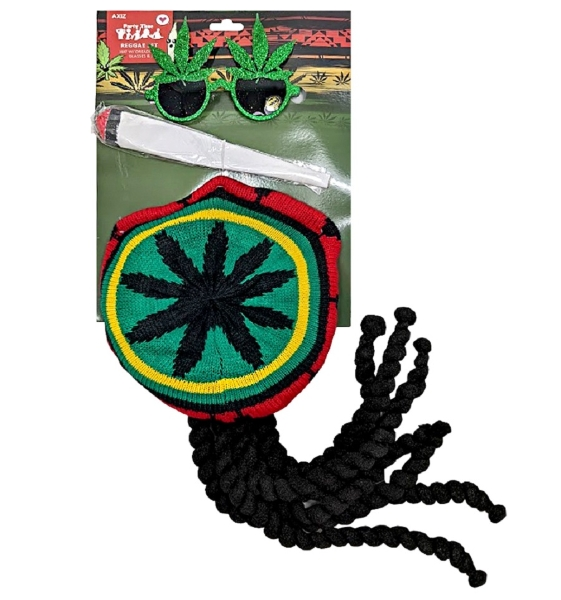 Includes – hat with dreadlocks glasses and joint –