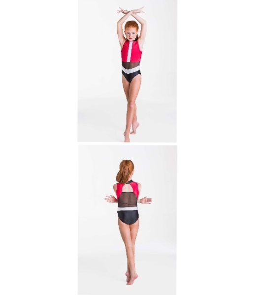Includes turtle neck short sleeve leotard with mesh wasit band.