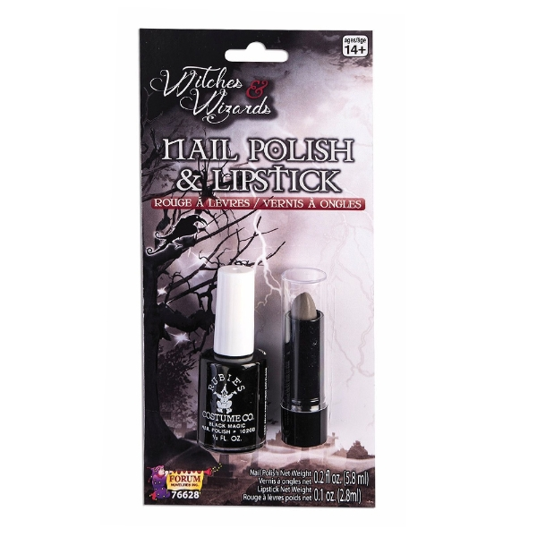 Includes manicure friendly peel-off polish matching black lipstick –